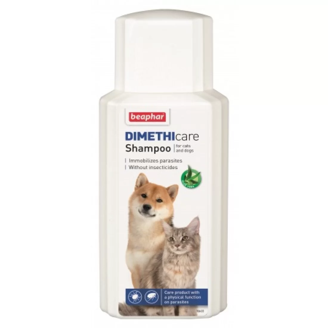 Dimethicare Shampoo (200 мл) за кучета и котки. Дуо-комплексът за подхранване с Алое Вера и Диметикон парализира бълхи, кърлежи и други насекоми като например комари, въшки, ларви, пясъчни мухи и други по изцяло физичен начин. Този продукт не съдържа химически инсектициди.