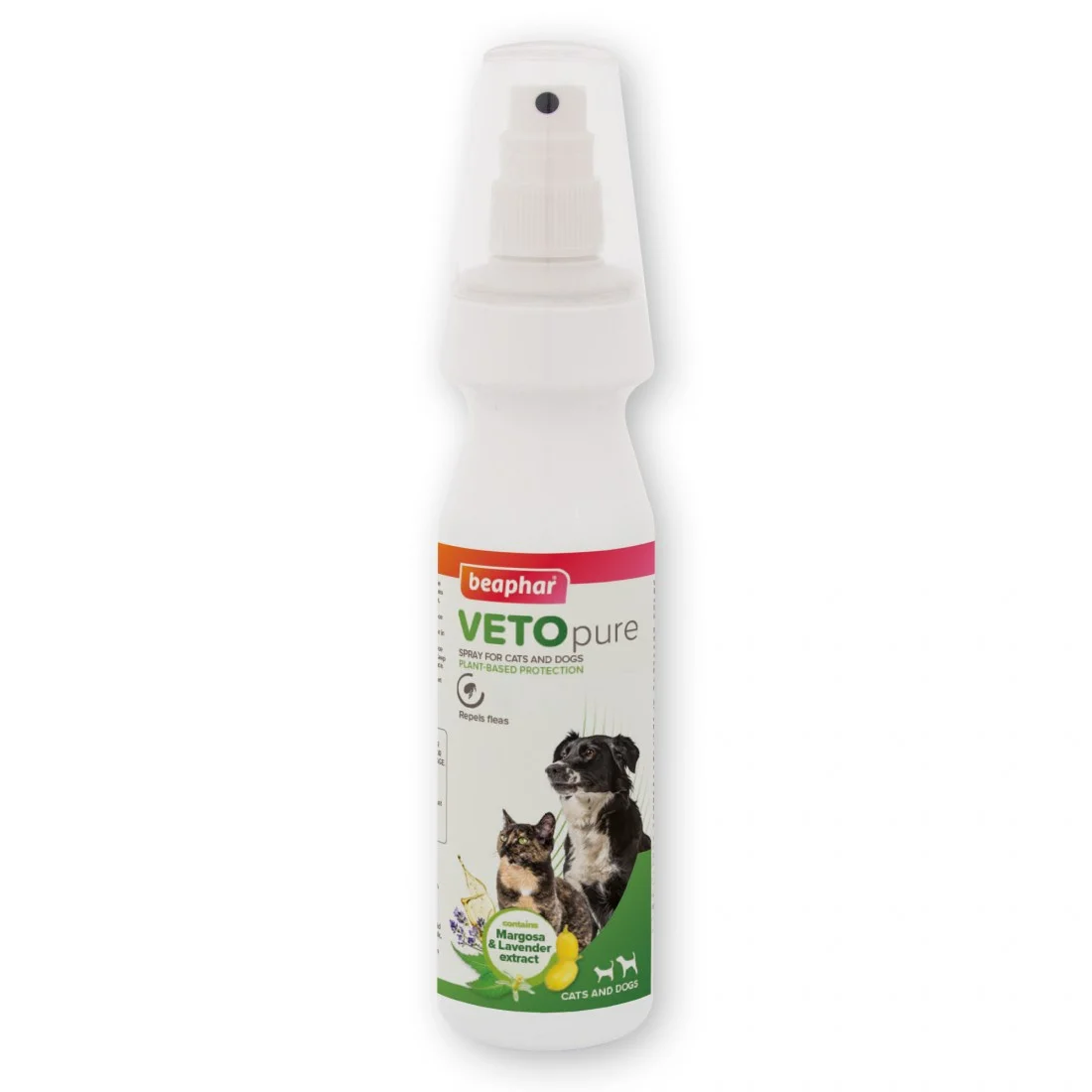VETOpure Bio Spray от Beaphar е ефективен срещу бълхи. Спреят съдържа две активни съставки: екстракт от маргоза и лавандула. Маргозата се извлича от дървото нийм, което е известно със своите свойства да отблъсква бълхите. Лавандулата има натурално репелентно действие срещу насекомите благодарение на аромата си. Продуктът е подходящ за кучета и котки на възраст над 12 седмици.