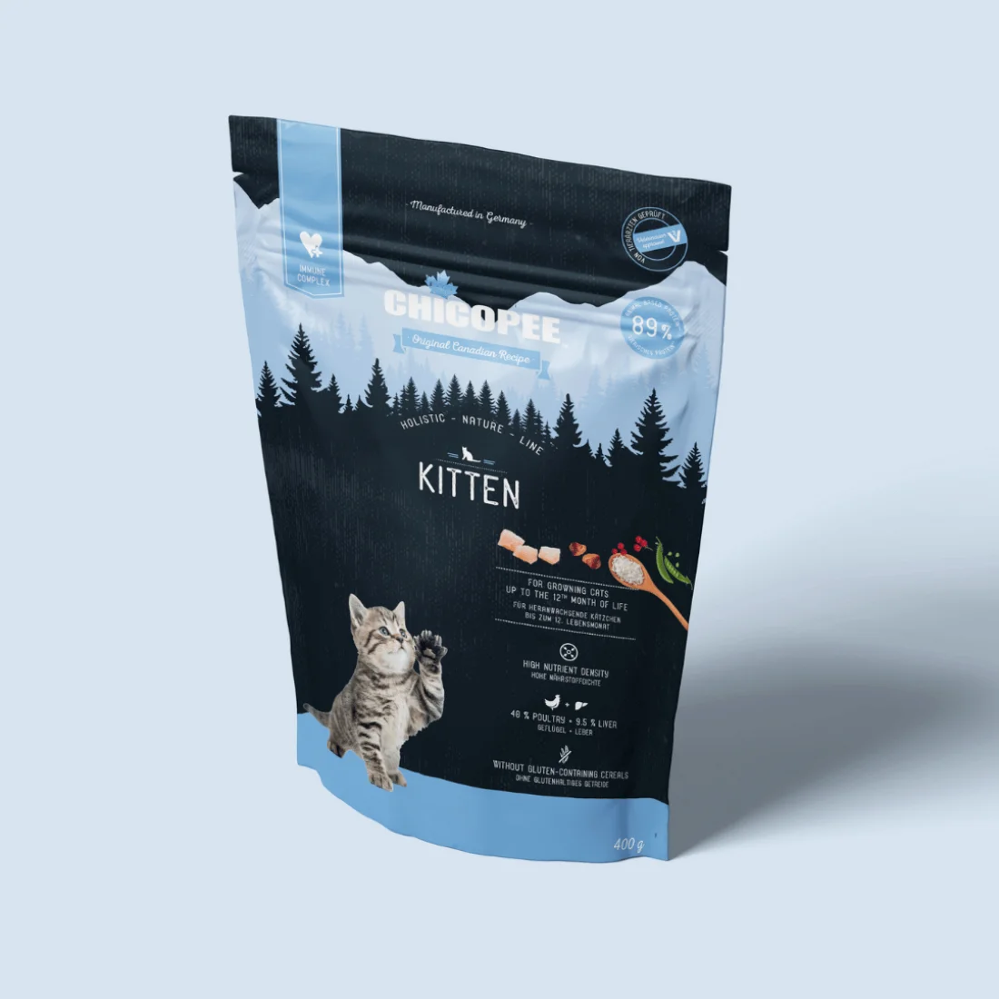 В Chicopee Holistic Kitten съзнателно не използваме зърнени култури, съдържащи глутен (включително пшеница). Затова храната е особено подходяща за котки с чувствителен стомах. В рецептата използваме лесно смилаеми източници на въглехидрати, като ориз и грах. Добавените 9.5% черен дроб (пресен и дехидратиран) допринасят за изключително вкусово изживяване.
