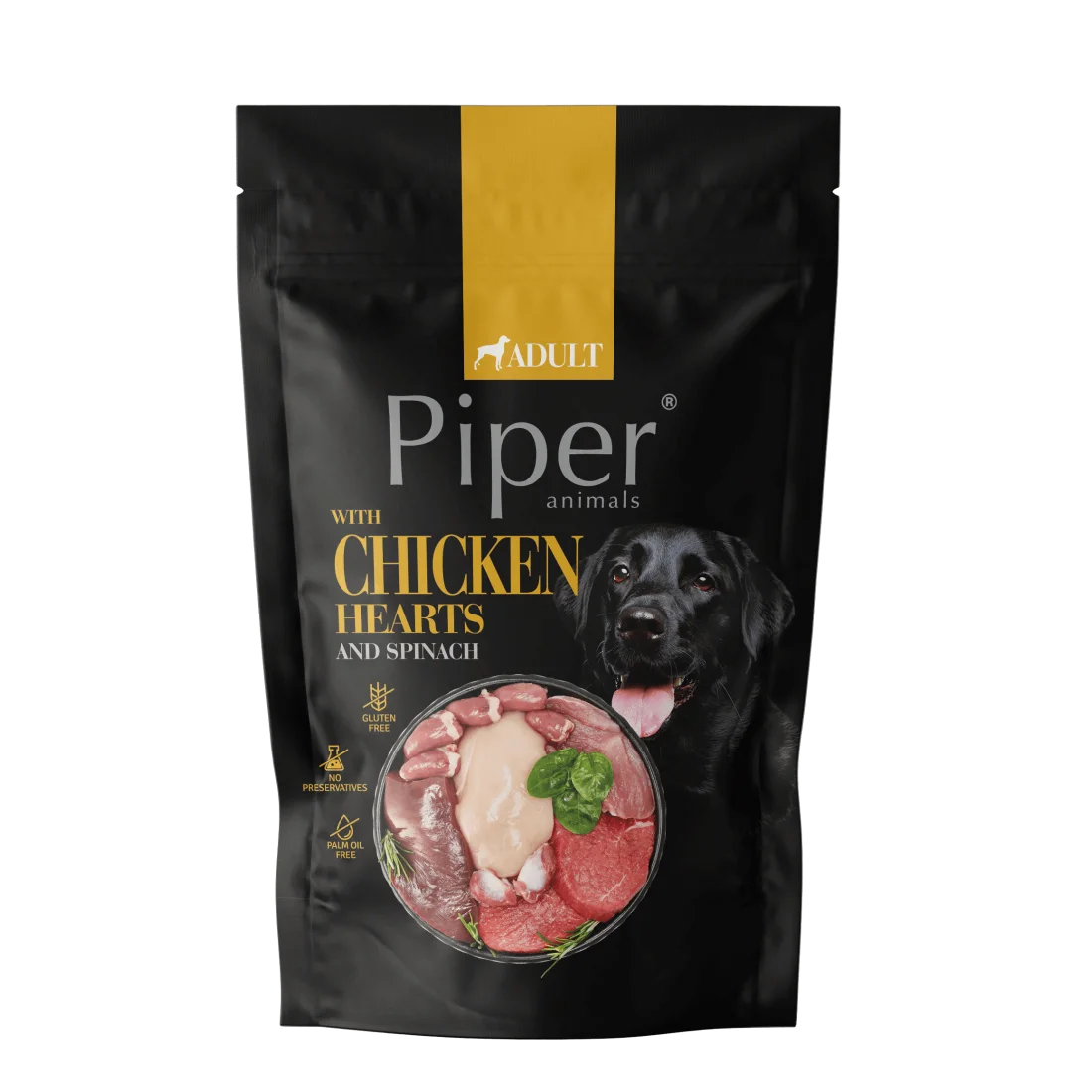 Пълноценна храна за кучета от всички породи с пилешки сърца, кафяв ориз и спанак.